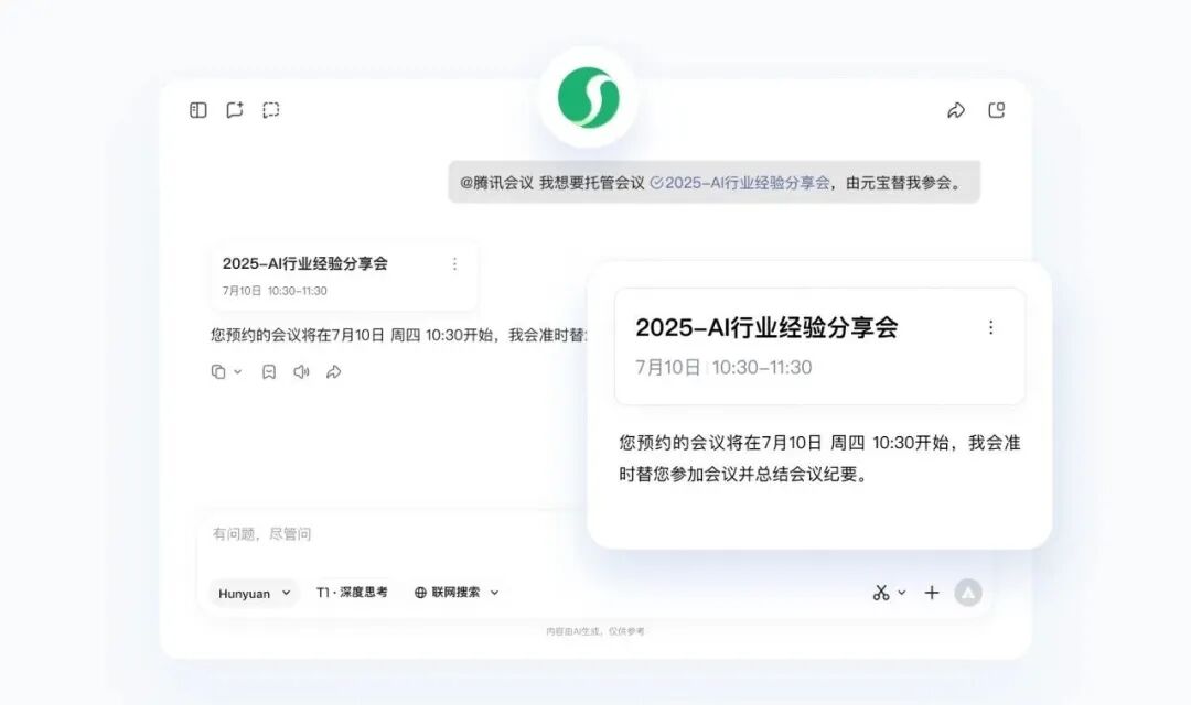 • 会议日程撞车或是临时有事,还可以让由腾讯元宝提供服务的「AI托管」帮你听会和总结。