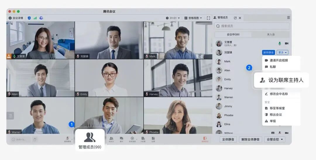 年终答谢活动会上,用上多位联席主持人一起维持现场秩序——审批进场、控麦控视频、管权限,一个不落。商业版最高支持10位,专业版最高支持4位噢!