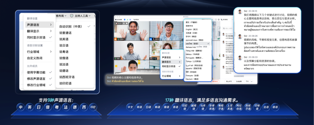在提升翻译准确度的基础上,还丰富了支持的语言数量。现在,腾讯会议在支持17国目标语言翻译上,声源语言自由说的能力提升到了9种。