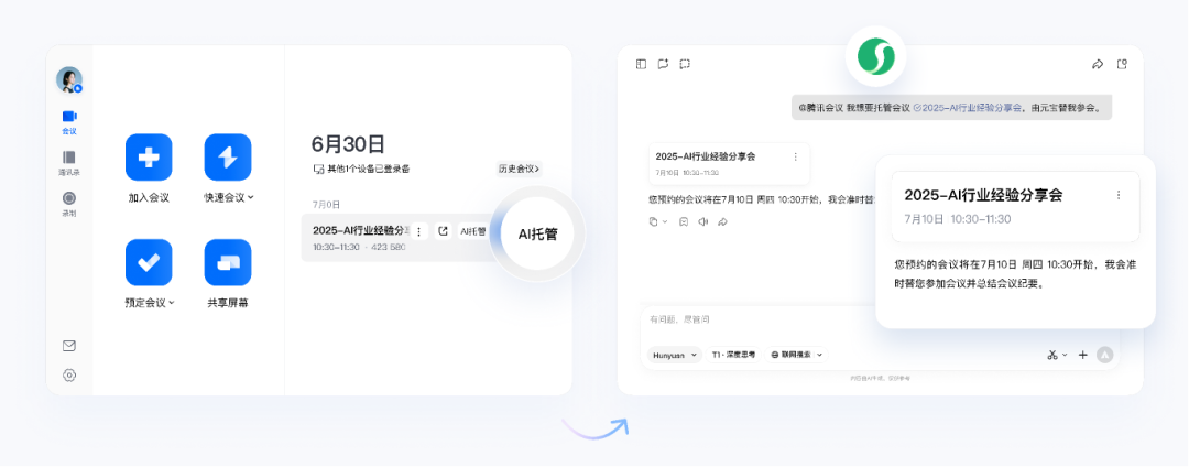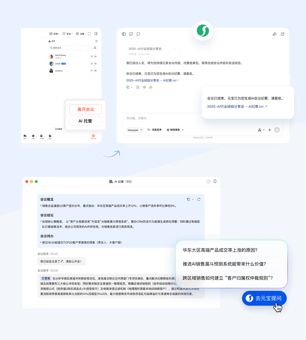 您都可以随时开启AI托管,开启后,将自动拉起腾讯元宝帮你参会、听会并记录,会议结束后,元宝还会输出完整的会议纪要。