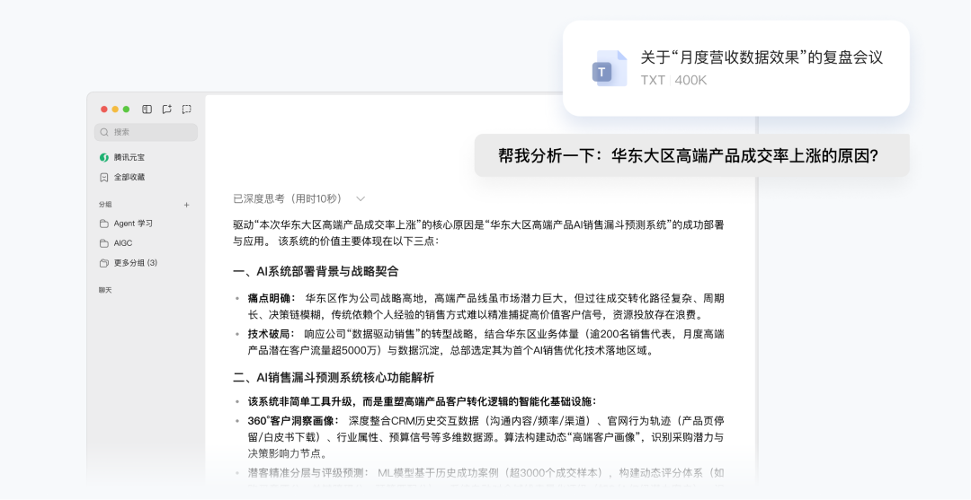 无论是自动整理出多种格式的会议纪要,还是进一步追问会中细节、联网搜索更多资料,元宝真正将会议信息从静止的文字转化可流动、可被应用的业务资产,让企业员工实现了会中讨论与会后延伸思考的无缝衔接。
