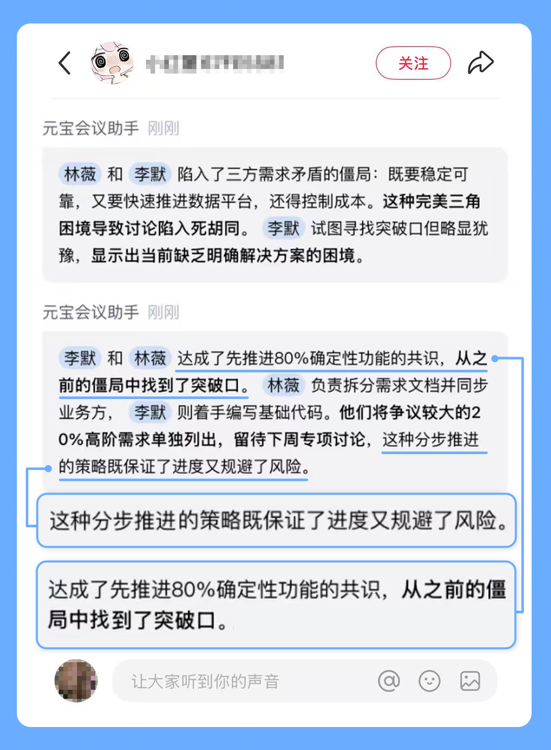 今年你跟同事进行了几次对接,你们在某个节点同时察觉到了讨论的瓶颈。你们同时选择了:“先推进能确定的。”虽然无奈,但AI纪要里那些清晰拆解的待办事项最后被你们逐一跟进解决,那是专业协作中另一种珍贵的能力:在瓶颈处果断暂停,将难题拆解成可解决的事项。