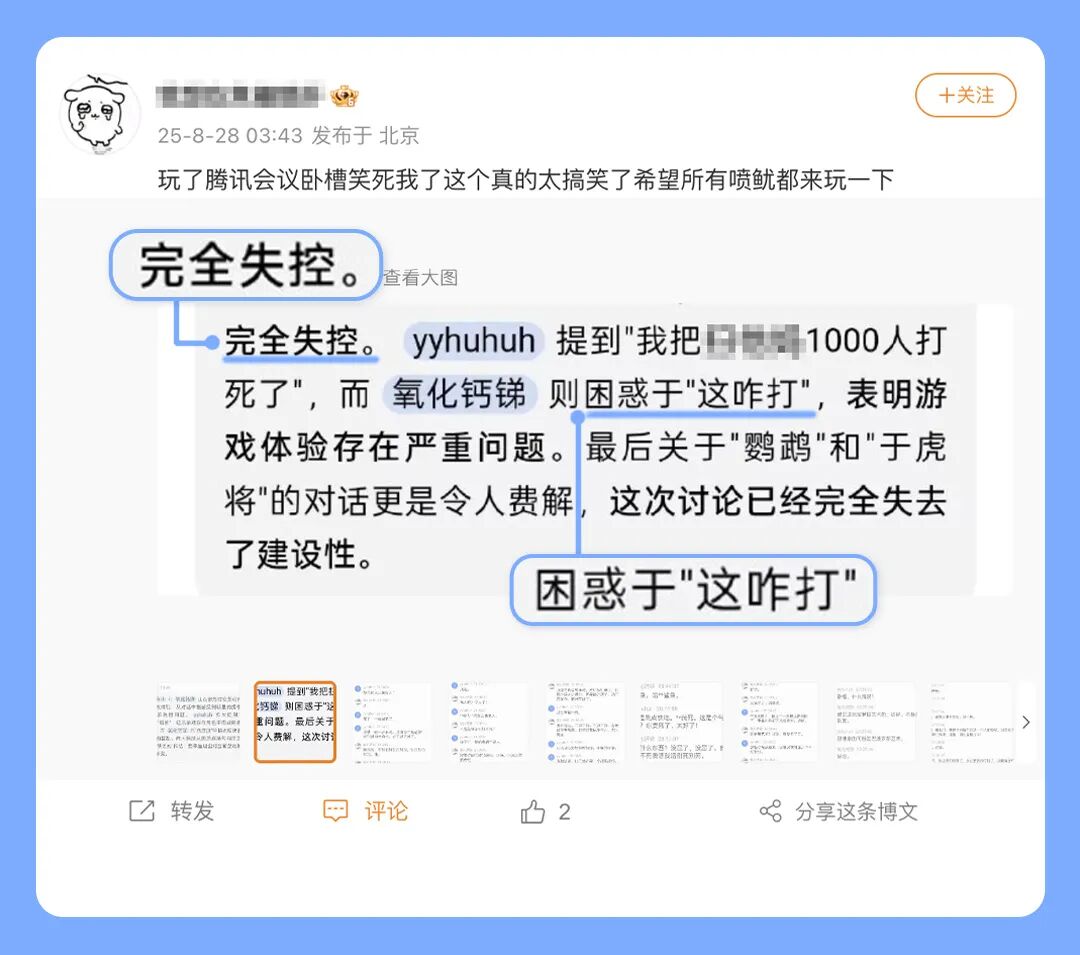 除了工作,AI纪要还记录了很多意料之外的声音。2025年,你发明了用腾讯会议连麦打游戏,“失控”是你的AI纪要高频词。但在这些“失控”的后面,紧随其后的都是朋友们此起彼伏的欢笑声。