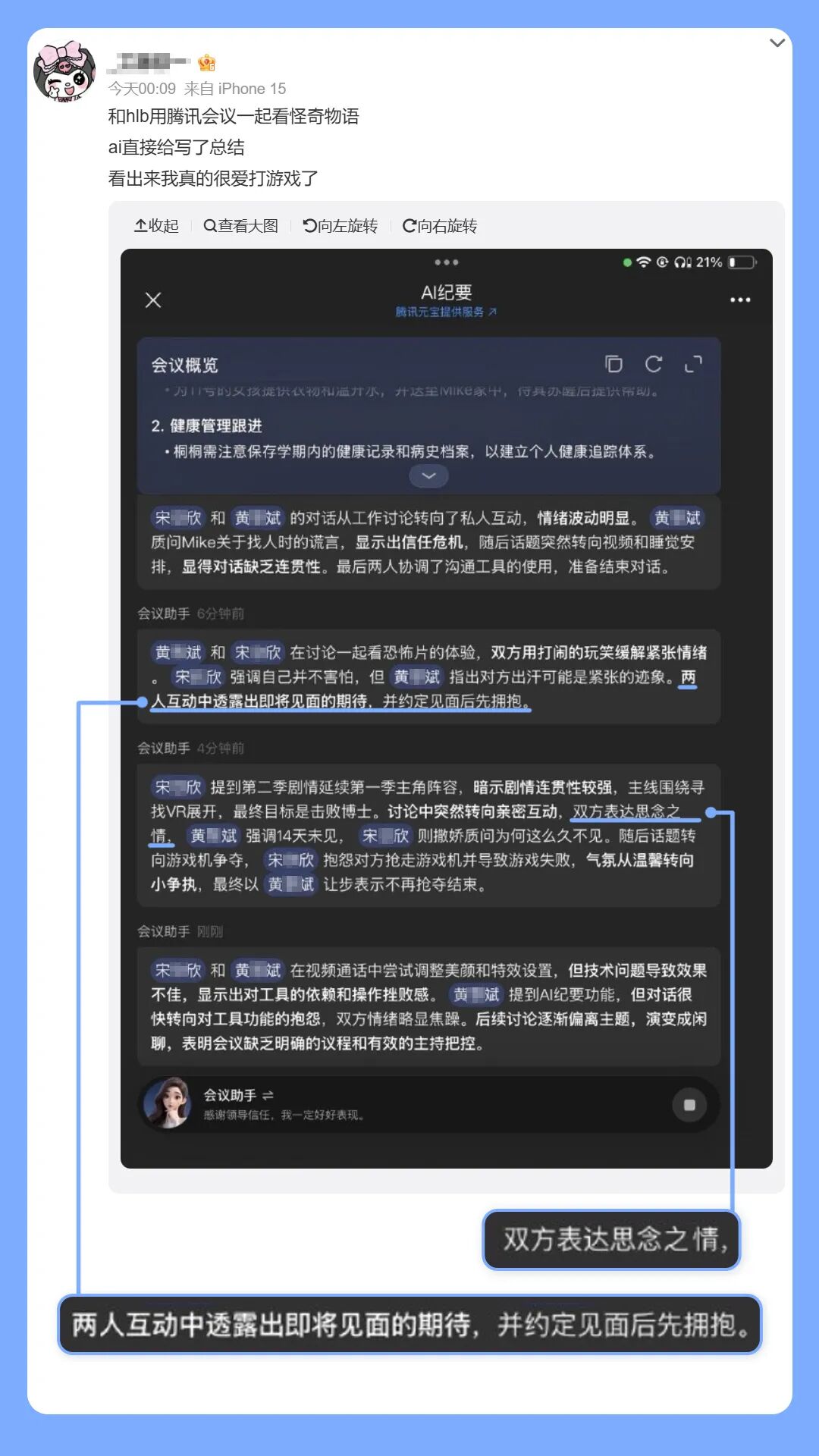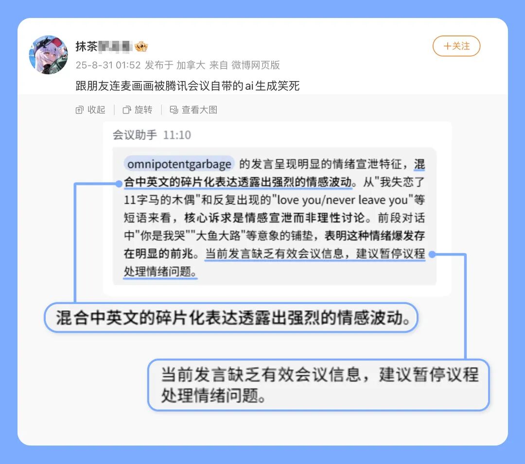 有时候,AI纪要也会因为洞察到的情绪过于强烈而给出“有思考”的建议。比如这位朋友发现,AI纪要曾在自己和朋友连麦画画的时候,建议暂停议程先处理情绪问题。