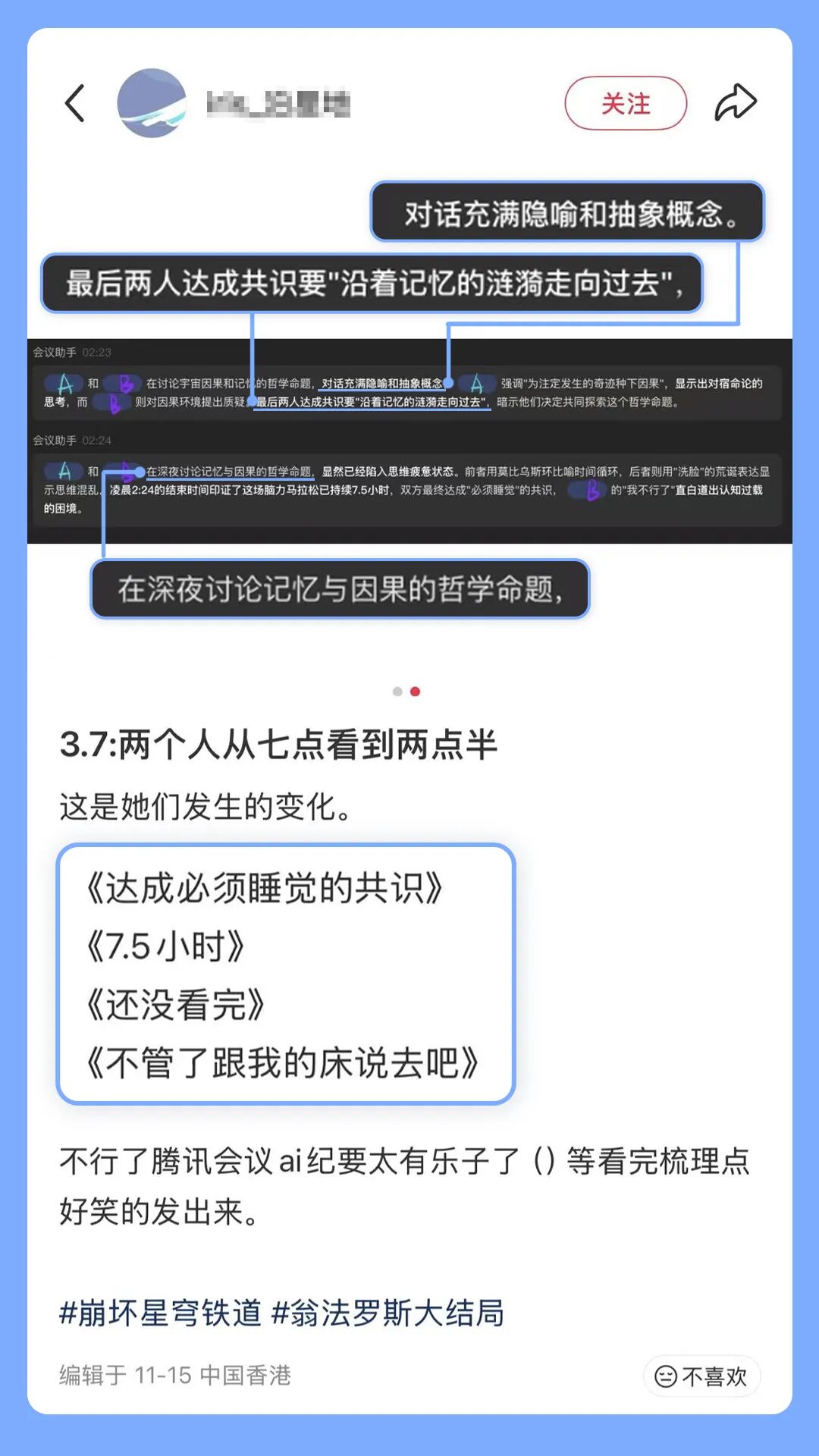 AI纪要也陪伴了你们7.5小时线上聊天,一起讨论宇宙因果和记忆的哲学命题。下线时已是深夜,但AI纪要记得你们共享过同一片思想的星空。