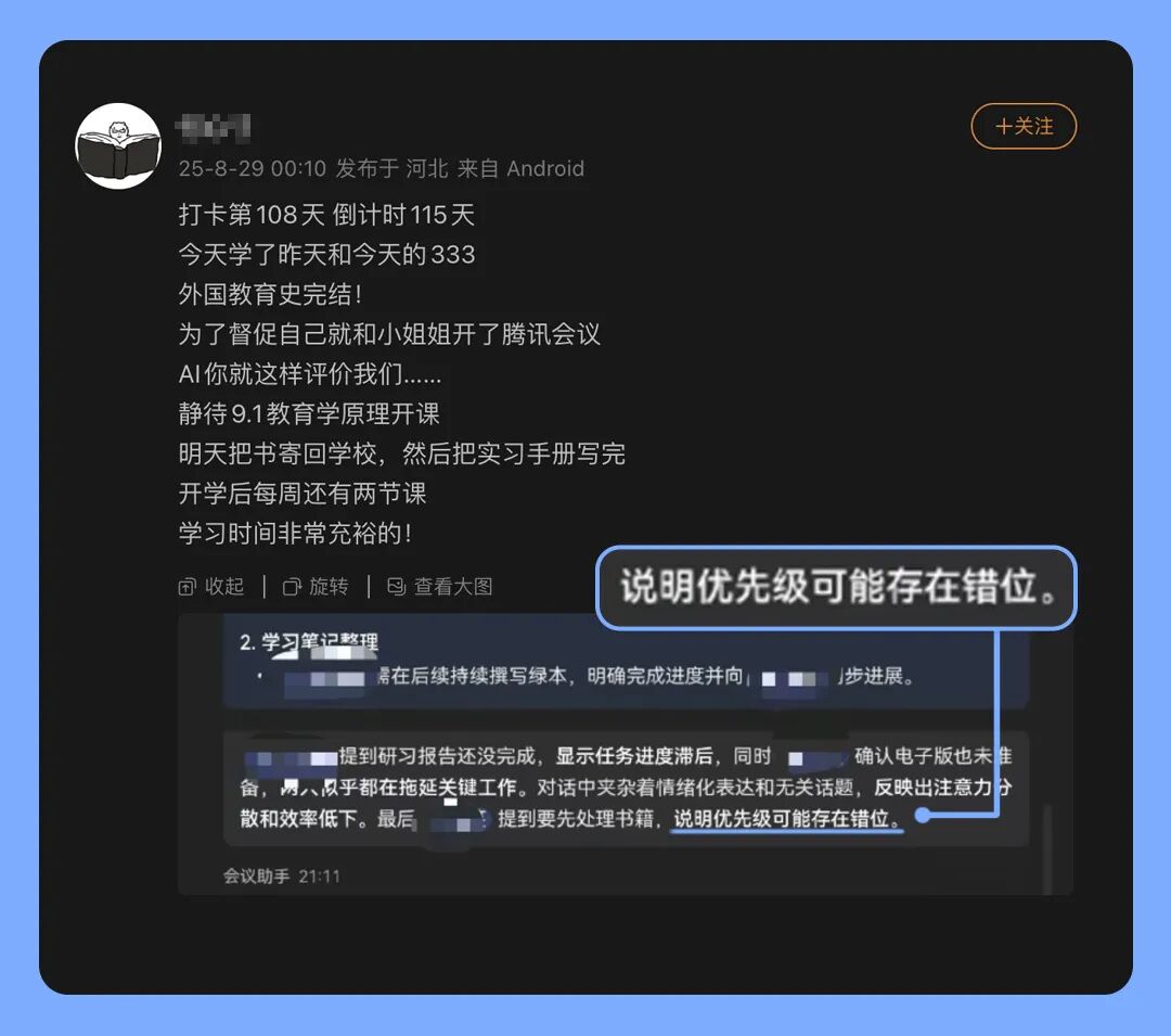 即使是你们和同学一起充实的云自习,AI纪要也会提醒关注优先级,关注注意力和效率的提升。希望你们这个学期的考试成绩都十分满意!