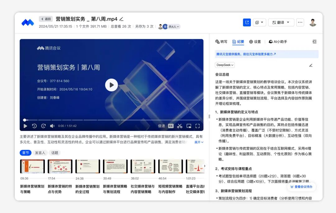 • 让「AI纪要」帮你专门2分钟一次替你总结进度、在旁边悄悄读懂气氛与态度变化、标记待办和责任人,还能跳转元宝继续追问,让任务不再“会议结束就失踪”。