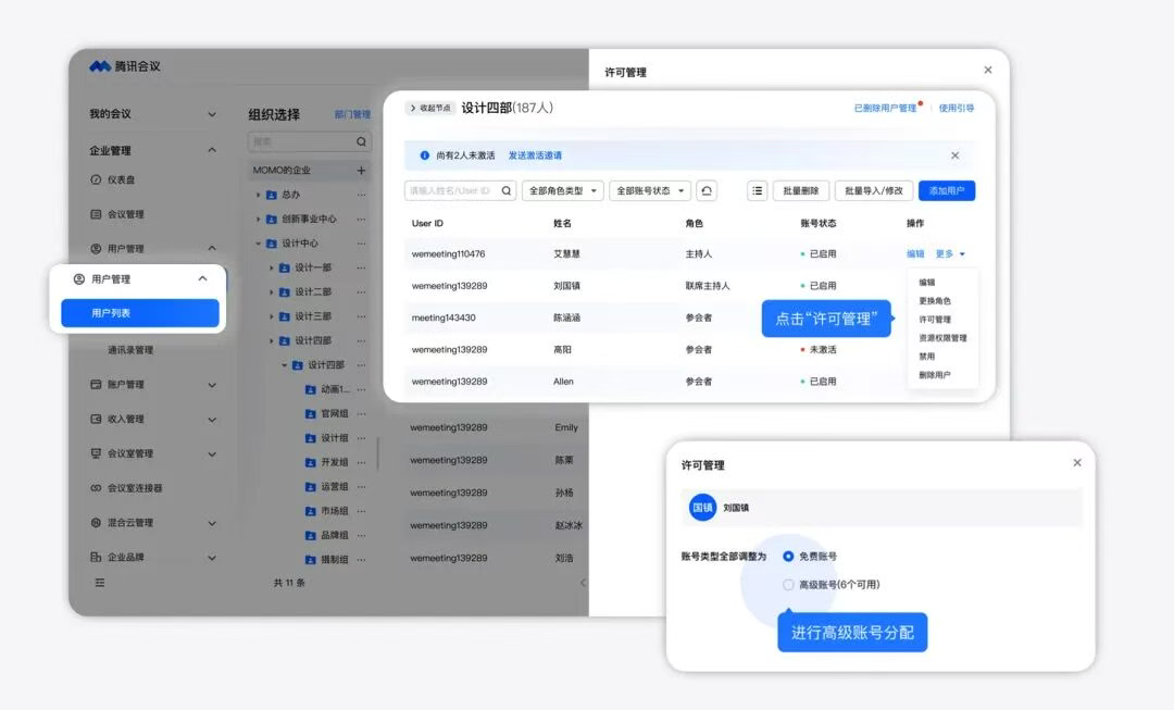 现在,前往活动页下单,统一购买和分配给员工的商业版高级账号归属您的企业所有,可重新分配给其他企业成员,并且支持对离职员工账号下的会议资产(待开会议、云录制等)进行删除或者转移给其他同事,高效交接,保障会议资产的安全流转。