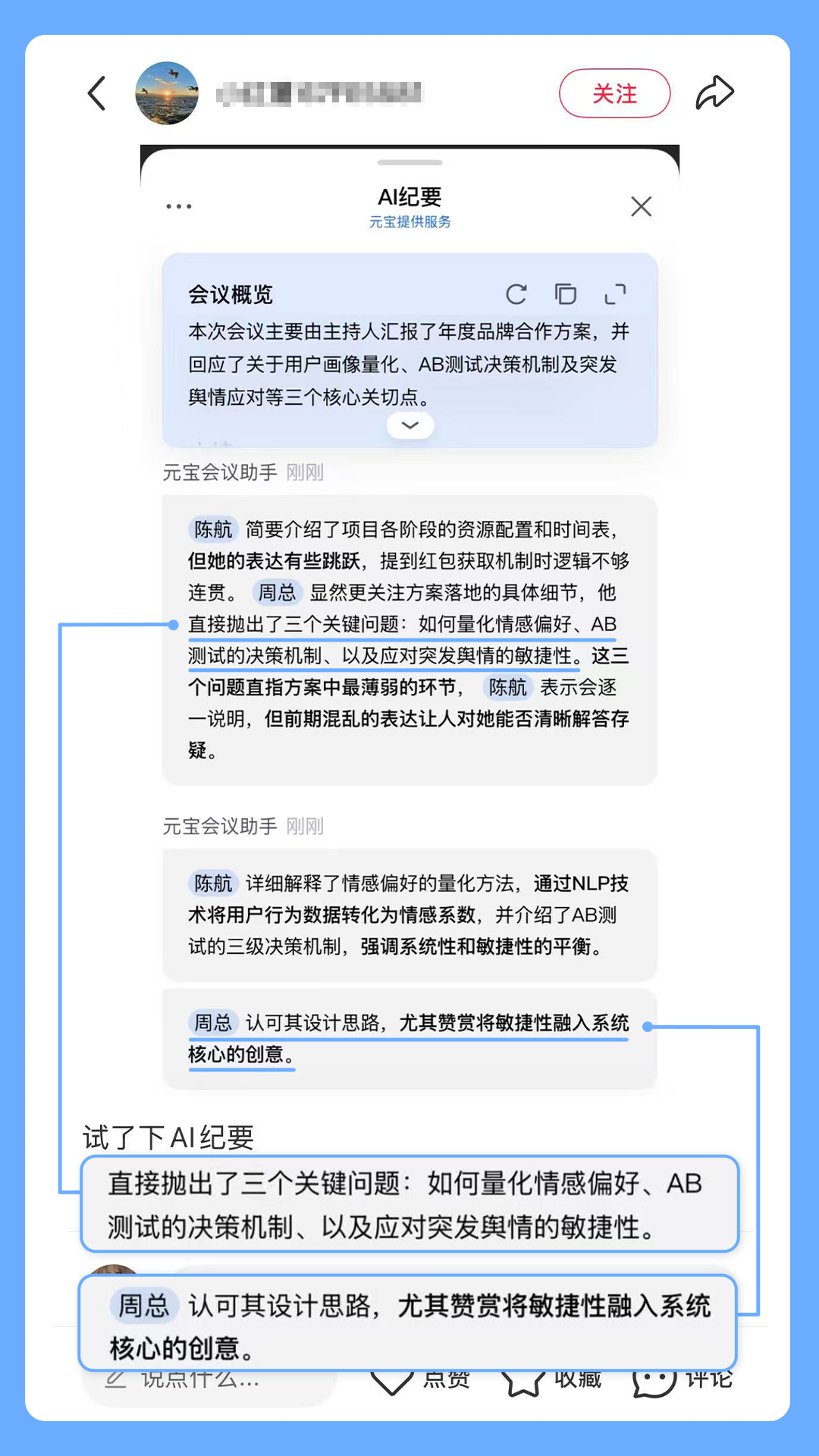 还有那次跟客户的重要会议上,作为主要汇报人的你有些紧张,专注于把方案阐述得准确详细,AI纪要帮助你记录下了客户追问的几个关键要点,你围绕这些内容交出了一份完美的答卷。