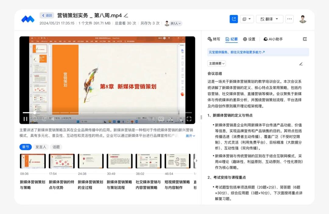 打开云录制链接,课程已经被清晰地按章节、话题拆分,快速定位,优先回顾不清楚不明白的重点内容。(Tips:开启2倍速,1分钟看2分钟内容,回顾更快速哦!)如果只有本地音视频也不用担心!支持批量上传音频或视频文件,勾选【自动生成转写并开启智能化功能】。腾讯会议将会生成全课的转写,同样按主题、章节进行了分段,以方便回顾复习。